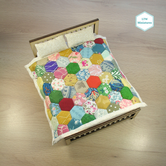 Scrappy Hexies Double Quilt and Pillows for 1:12 Dollhouse