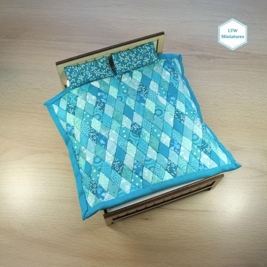 Turquoise Diamonds Double Quilt and Pillows for 1:12 Dollhouse