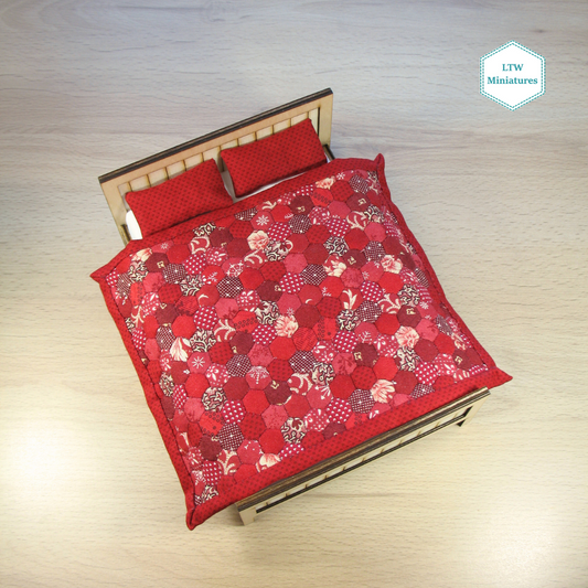 Red Hexies Double Quilt and Pillows for 1:12 Dollhouse