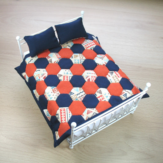 Summer Heat 1/4" Hexies Double Quilt and Pillows for 1:12 Dollhouse