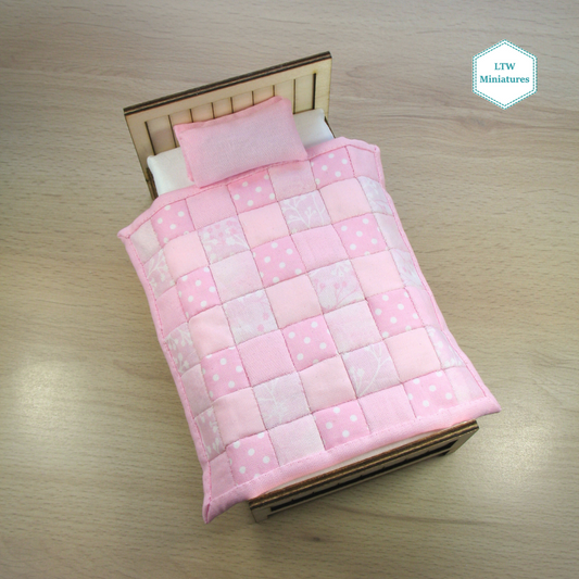 Pink Squares Single Quilt and Pillows for 1:12 Dollhouse