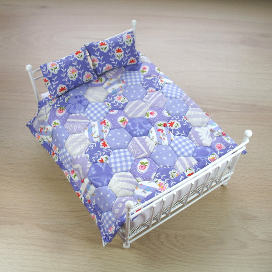 Purple Hexies Double Quilt and Pillows for 1:12 Dollhouse