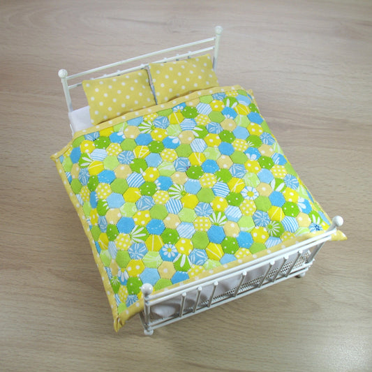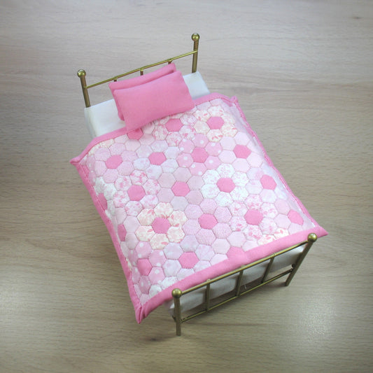 Summer Heat 1/4" Hexies Double Quilt and Pillows for 1:12 Dollhouse