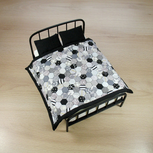 Black and Grey Hexies Double Quilt and Pillows for 1:12 Dollhouse