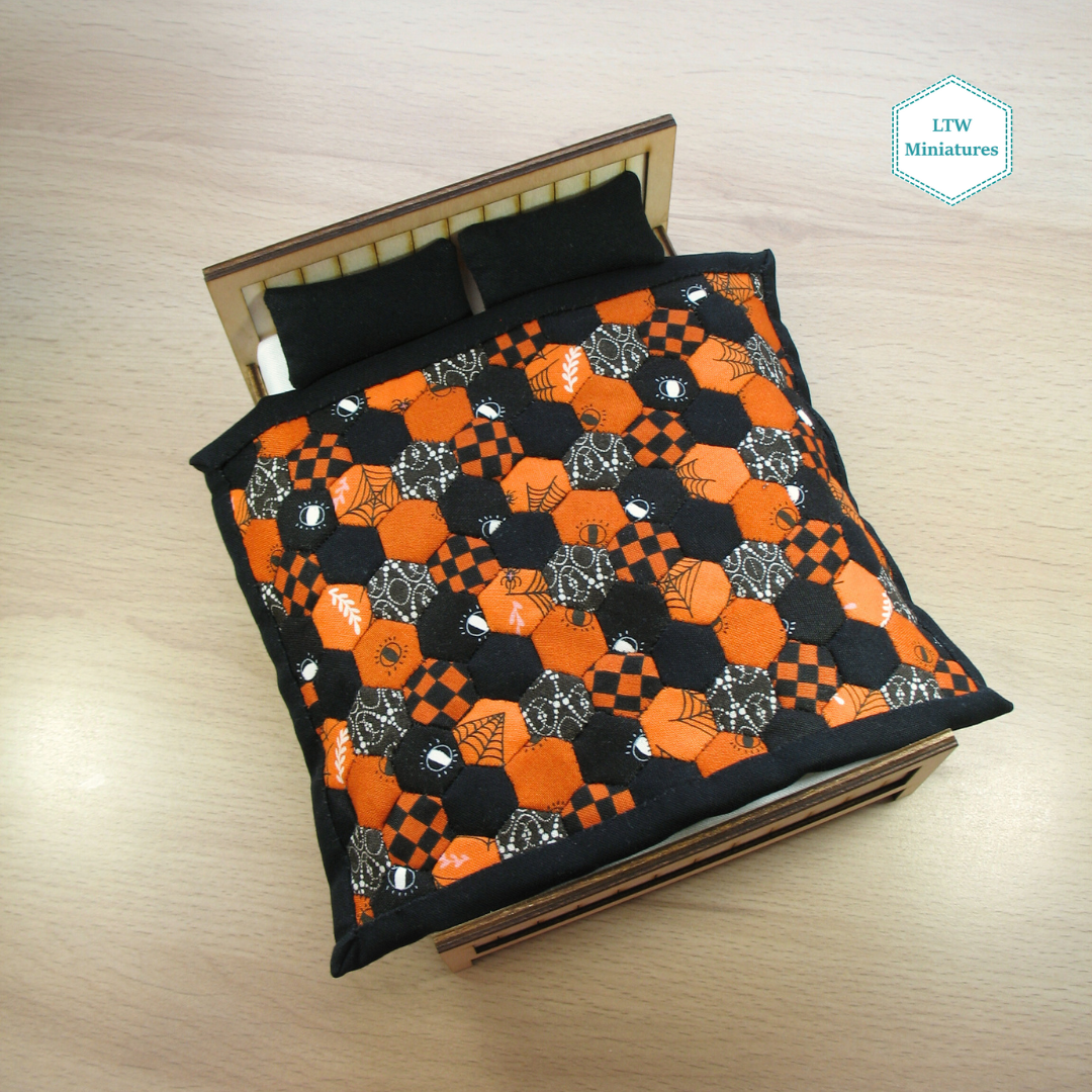 Halloween Hexies Double Quilt and Pillows for 1:12 Dollhouse